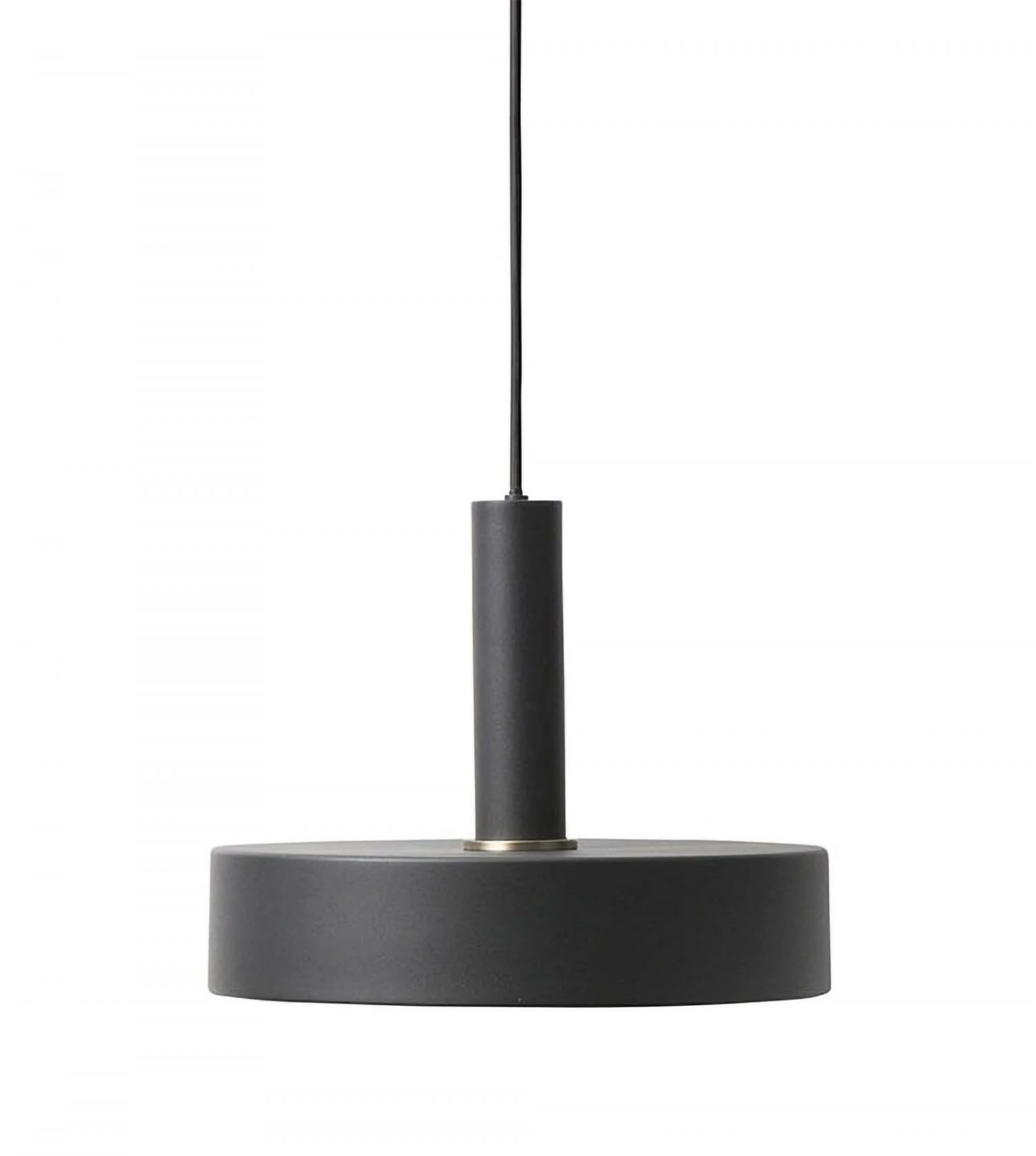 Ce modĂšle prĂ©sente une combinaison de la suspension Collect Ferm Living grand modĂšle et de l’abat jour disc noir.