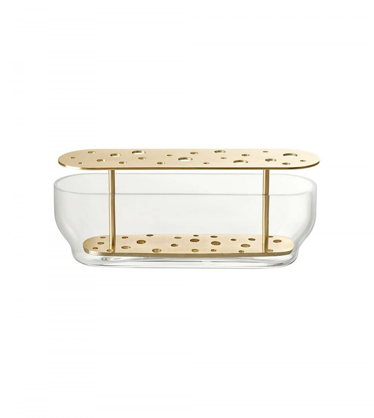 Comme dans une auberge espagnole, chacun a participé à sa manière à cette élégante création. La débordante imagination du designer a donné naissance au vase Ikebana Long, mettant à l’honneur l’art floral japonais à travers une création conçue artisanalement pour Fritz Hansen. Le verre rencontre ici une structure en laiton ponctuée d’orifices permettant le passage d’une tige ou d’un branchage. L’ensemble, graphique et épuré révèle l’agencement harmonieux de la matière. Une composition zen, une pièce design unique pour tout type de décoration, de la plus sage à la plus audacieuse. Sur une table basse dans un salon, sur le rebord d’une fenêtre dans une salle de bains et partout ailleurs dans la maison, le vase long Ikebana Fritz Hansen fait souffler un vent de fraicheur et vibre d’une délicatesse toute nippone. La maison danoise poursuit son exploration des possibilités offertes par le design en collaborant avec de jeunes créatifs comme Jaime Hayon tout en continuant l’édition des pièces iconiques imaginées il y a quelques décennies par Arne Jacobsen. Avec la gamme de vases Ikebana Fritz Hansen fait souffler un peu de poésie à travers des objets célébrant l’évanescence des choses. Délicieux haïkus.