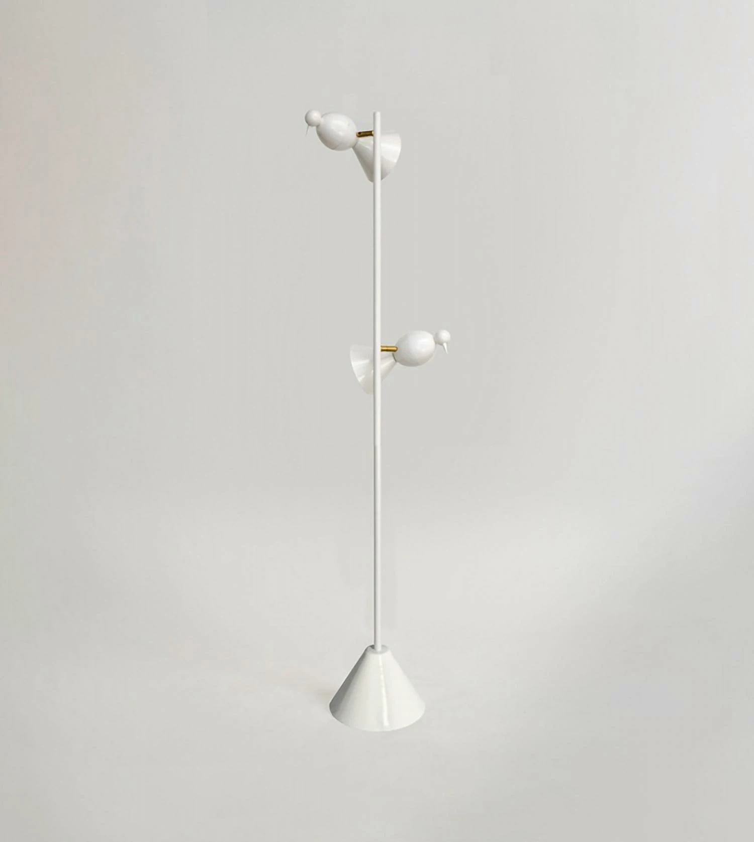 Oiseau iconique de la marque Atelier Areti, volatile synonyme de joie et de liberté, l’alouette s’est posée sur une gamme de luminaires design ludiques et poétiques à laquelle appartient le lampadaire 2 birds. Comme pour les autres lampes de la collection imaginée autour du charmant petit oiseau connu pour son irrésistible attirance pour la lumière le lampadaire 2 Alouettes (ainsi que le modèle 3 birds en vente chez BLOU) la maison Areti a imaginé des réflecteurs de lumière dont la forme reprend la silhouette du volatile qui aurait choisi de se poser sur une branche ou un perchoir. Ludique et délicate la lampe 2 alouettes floor light Areti n’en n’est pas moins fonctionnelle grâce à ses spots orientables individuellement qui offrent un supplément de confort à ce luminaire graphique à piètement conique. Disponible en plusieurs versions avec la possibilité de choisir un réflecteur avec intérieur laiton, il s’accordera avec une grande variété de décorations (tendance, classique, etc.) et apportera une touche légère et joyeuse dans toute la maison, de l’entrée à la chambre à coucher en passant par le séjour et la salle à manger. A côté de fauteuils ou d’un canapé pour les amateurs de décoration bavards comme des pies ou les oiseaux de nuit, le lampadaire 2 alouettes de la marque Atelier Areti ne manque pas d’arguments pour faire son nid dans de nombreux intérieurs. A l’image de l’ensemble du catalogue le lampadaire 2 birds Areti est fabriqué uniquement à la demande par des artisans talentueux qui savent dompter la matière et la sublimer. Chaque pièce lumineuse design signée Areti porte une promesse, celle de durer au moins un siècle. Si une hirondelle ne fait pas le printemps, deux alouettes sont synonymes de talent.