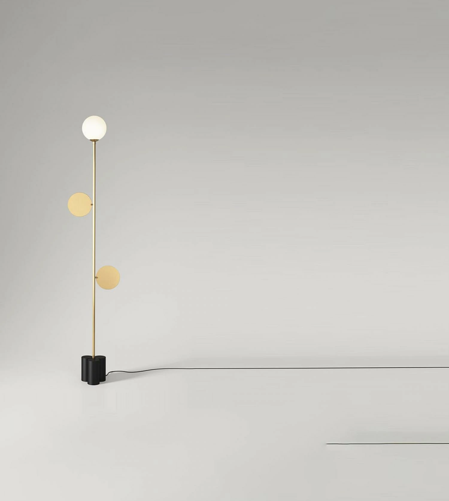 Avec son lampadaire Plates la maison Atelier Areti démontre une fois de plus (comme avec le lampadaire disc and sphere en vente chez BLOU)  qu’un luminaire épuré peut être magnétique et solaire. La lampe Plates floor light Areti, élégante et délicate, douce et chaleureuse, est une harmonieuse association de formes géométriques simples, un accord parfait entre plusieurs figures polygonales : un piètement composé de 3 cylindres, deux disques en laiton (ou métal thermolaqué selon la finition choisie) et un globe en verre soufflé. La sphère, le cercle, le cylindre, tout tourne autour du rond qui est ici à l’honneur. Le long de la structure longiligne du lampadaire Plates édité par la maison Areti (en laiton brossé ou métal thermolaqué noir ou blanc) deux plateaux, les « plates » évoqués dans le nom, ont pris place pour y rayonner, chacun à sa propre hauteur. Solution d’éclairage design pour séjours, salles à manger, bureaux, chambres à coucher, le lampadaire Plates Areti diffuse une lumière douce et chaleureuse délicieusement enveloppante, idéale pour les dîners conviviaux, les discussions de salon ou les soirées dédiées à la lecture. Lampadaire design à globe opalescent chic et graphique, il possède une silhouette et une personnalité lui permettant d’intégrer des intérieurs variés en fonction des déclinaisons choisies (base noire ou blanche, structure en laiton ou métallique). La couleur dorée du laiton et la sobriété du noir et blanc offrent de multiples possibilités de l’accorder à son univers décoratif. Les amateurs de design qui apprécient la maison Atelier Areti depuis ses débuts en 2008 connaissent le haut degré d’exigence caché derrière chacune des pièces proposées par la marque : chaque objet a été fabriqué artisanalement, à la demande, avec des matériaux rigoureusement choisis pour leurs qualités intrinsèques. Le tout dans le plus grand respect des normes environnementales avec un but : que les luminaires design Atelier Areti durent au moins cent ans. Avec son lampadaire Plates Areti nous livre l’excellence sur un plateau.