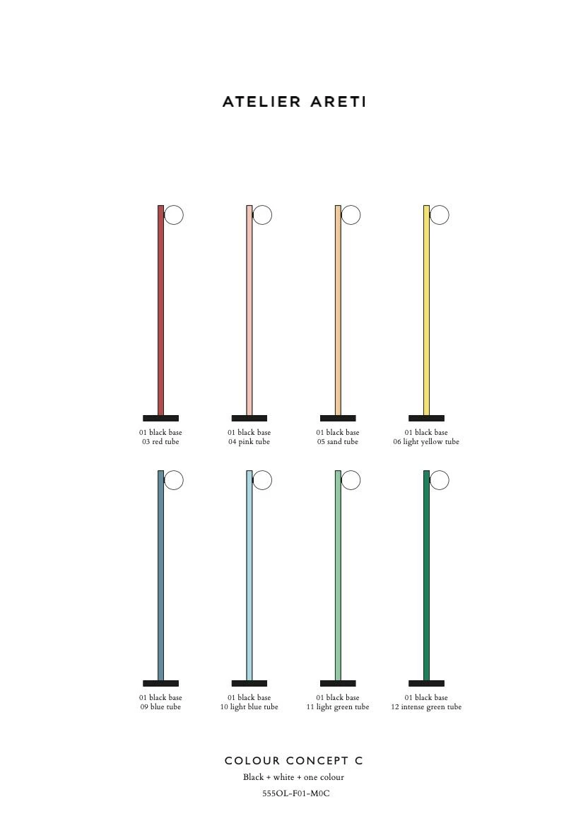 Atelier Areti décline son lampadaire Tube with Globes and Cones en 4 concepts, 4 manières d’associer les différentes finitions colorées proposées. Le modèle Concept Colour C, avec sa base noire, son ampoule sphérique blanche et son corps tubulaire coloré permet d’imaginer une lampe design personnalisée à la hauteur de ses ambitions décoratives.
