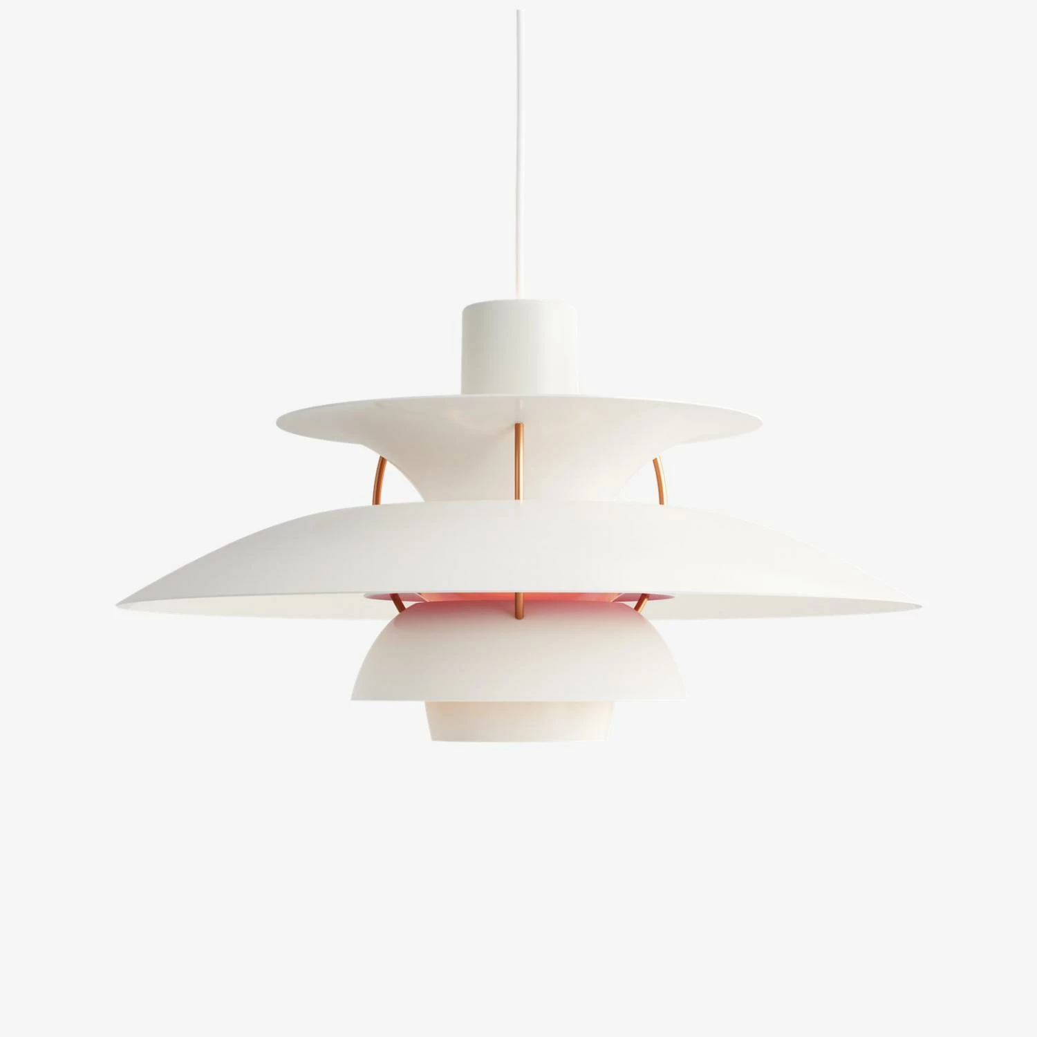 La suspension PH5 fournit une lumière 100% anti-éblouissante. Elle est conçue selon le principe de l’ensemble abat-jour réfléchissant, qui dirige la majeure partie de la lumière vers le bas. Ensuite la suspension émet une lumière dirigée vers le bas ainsi que vers les côtés, et s’éclaire elle-même.
