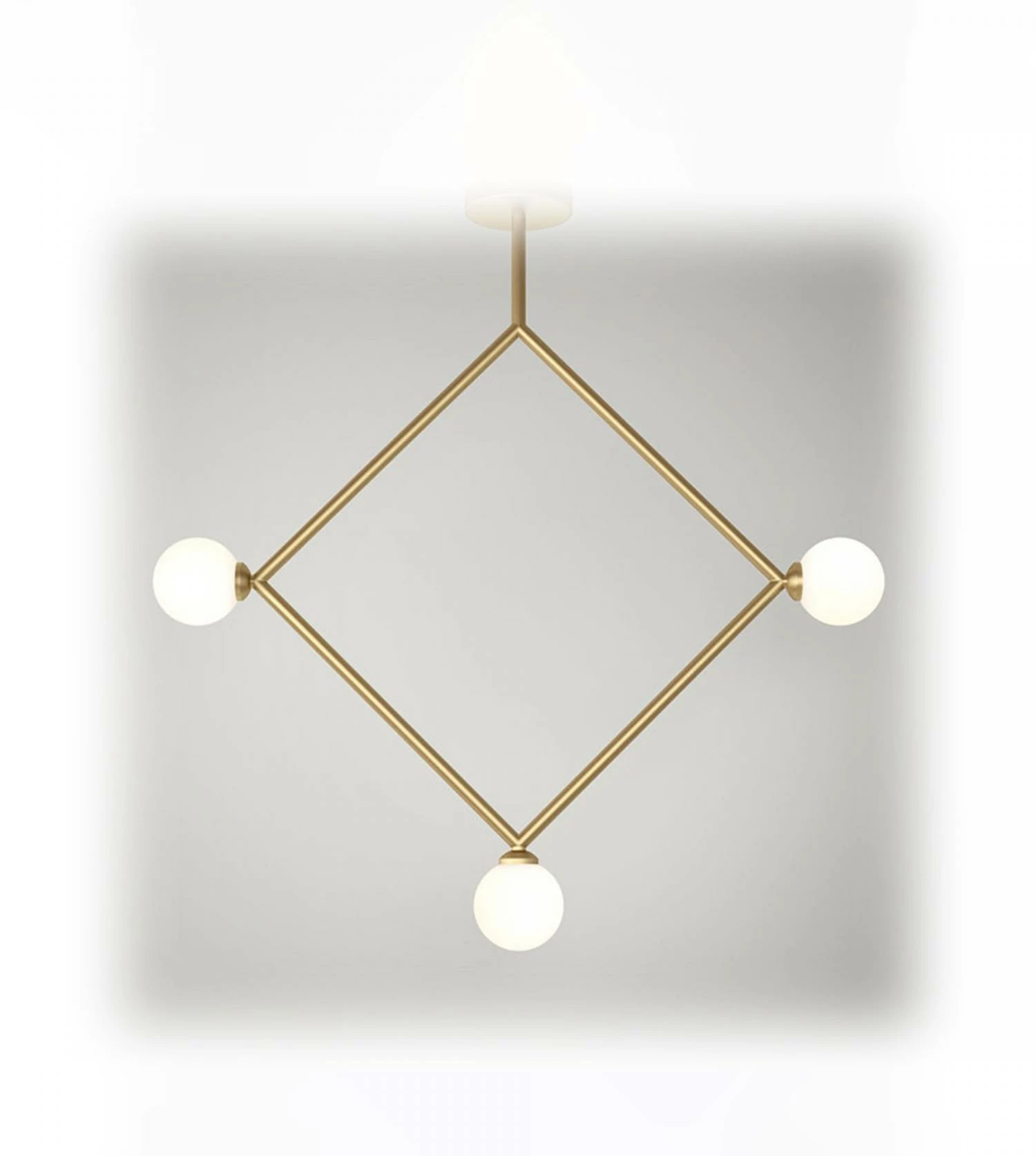 Après le cercle et le triangle, Atelier Areti poursuit ses expérimentations géométriques en proposant aux amateurs de design un luminaire solaire en forme de losange : la suspension Rhombus à 3 globes. Le corps de la lampe en laiton Rhombus dont la fine structure épouse la forme du polygone symétrique dont elle porte le nom, simplement surmonté de 3 globes en verre soufflé, permet de prendre en compte l’arrière-plan de l’espace qui accueille le luminaire pour y composer une ambiance décorative idéale. Autour de la forme rhombique originale 3 ampoules forment un triangle radieux en autant de points cardinaux, élargissant ainsi le halo de lumière. Objet décoratif, solution d’éclairage design, luminaire omnidirectionnel, la lampe Rhombus pendant light Areti en laiton enchaine les rôles, cumule les fonctions, et poétise la géométrie. La suspension design Rhombus 3 globes qui se décline également en noir ou blanc peut intégrer une grande variété de décorations intérieures. Son côté graphique lui ouvrira les portes des intérieurs contemporains minimalistes alors que le laiton, noble et chaleureux s’accorde harmonieusement avec les inspirations décoratives plus classiques. La suspension Rhombus en forme de losange à 3 voire 6 ampoules (version avec globes doublés en vente chez BLOU), idéale pour un éclairage d’ambiance délicat, pourra exprimer tout son potentiel dans une entrée, une salle à manger ou un salon. On invitera bien volontiers la suspension Rhombus Areti au-dessus de sa table ou de son canapé. Fabriquée en petites quantités en Allemagne et uniquement à la demande comme l’ensemble des luminaires design Areti la lampe Rhombus est destinée à traverser allègrement les époques et les années. Avec la maison Areti pas de mauvaises surprises : tout est carré.