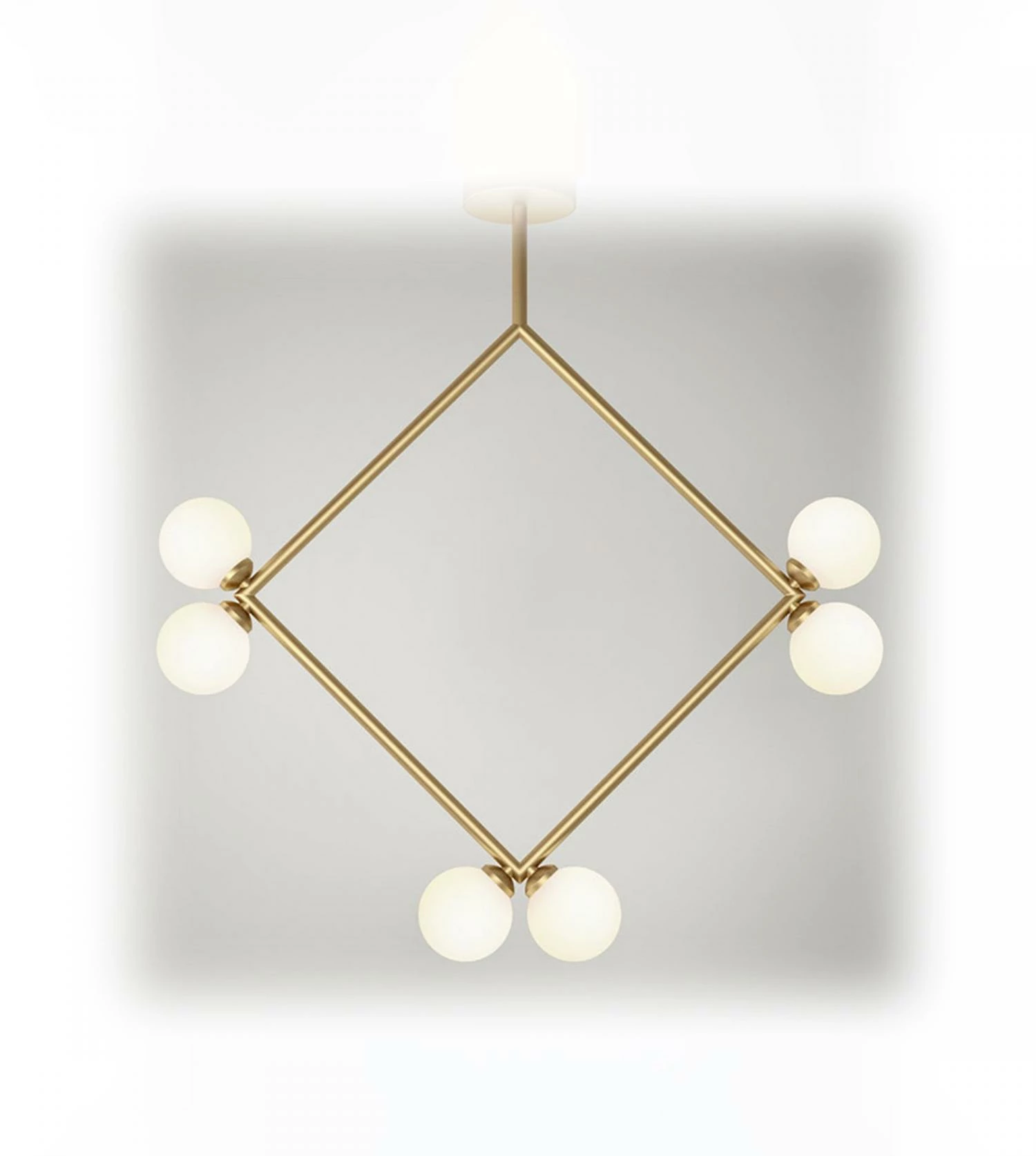Version extra lumineuse de la suspension Rhombus à 3 globes (en vente également chez BLOU), le plafonnier losange à 6 globes signé Areti double le nombre de ses ampoules, ajoutant une touche baroque à un luminaire d’origine plus épuré et graphique. Atelier Areti expérimente, décline, ajoute, soustrait des éléments et réinvente sans cesse ses luminaires, pour le plus grand plaisir des amateurs de design. La marque fondée en 2008 a su exploiter avec talent les différentes possibilités offertes par les figures géométriques élémentaires à travers une gamme de luminaires design graphiques et minimalistes : suspension Circle, suspension Triangle, applique Rhombus à 3 ou 6 globes lumineux. Luminaire solaire en forme de losange la suspension design Rhombus à 6 globes Areti en laiton, brille de mille feux sans s’imposer grâce à la finesse de sa structure polygonale qui permet de tenir compte de l’arrière-plan dans la composition d’un univers décoratif.  Disposées par paires autour de la structure en forme de losange les 6 globes lumineux opalescents de la suspension Rhombus Areti offrent un éclairage chaleureux et multidirectionnel. En laiton ou en métal thermolaqué noir ou blanc (voir dans caractéristiques), la lampe Rhombus 6 globes pendant light s’accorde avec une grande diversité d’univers décoratifs (modernes, classiques, minimalistes, industriels, etc.). Solution d’éclairage design, pièce décorative fascinante et radieuse, la suspension Rhombus 6 globes exprimera tout son potentiel dans une entrée, une salle à manger ou un salon, au-dessus d’une table ou d’un canapé. A l’image de l’ensemble du catalogue Areti la suspension Rhombus est fabriquée artisanalement et uniquement à la demande avec un objectif bien déterminé : celui de concevoir des luminaires design destinés à durer au moins cent ans. A 3 ou 6 globes la suspension Rhombus de la maison Atelier Areti appartient à la sphère des luminaires d’exception.