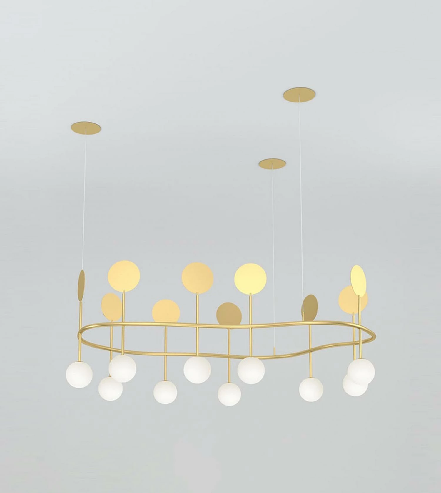 Hors-norme, charismatique et solaire, la suspension Row Rounded éditée par la maison Atelier Areti brille par sa beauté et son originalité. Luminaire design sculptural fabriqué en laiton, œuvre aux allures d’installation artistique, cette lampe chaleureuse et radieuse séduira les amateurs de décoration par sa personnalité atypique. Composée de 10 ampoules sphériques en verre soufflé réparties le long d’une structure arrondie, la suspension Row Rounded imaginée par Areti habillera de lumière les intérieurs spacieux qui vibreront d’un éclat nouveau grâce à cette solution d’éclairage chic et unique. Dans une symétrie parfaite les sphères de ce luminaire grand format font face à des disques en laiton, dans une célébration baroque de la rondeur. Ce n’est pas la première fois que la marque Atelier Areti associe le globe au disque de laiton. La maison propose en effet des versions lumineuses de ce type comme la suspension Row (en vente chez BLOU) plus épurée et sobre que la Row Rounded pendant light mais tout aussi poétique. Couronne de laiton aux pétales dorés, la suspension Row Rounded retenue au plafond par des câbles (ou des tiges métalliques selon la finition choisie) a été conçue en tenant compte de l’environnement qui saura l’accueillir afin de pouvoir l’intégrer pleinement à un univers décoratif. Luminaire design à la silhouette insolite, la suspension Row Rounded n’en demeure pas moins une lampe fonctionnelle à hauteur ajustable qui trouvera sa place dans une grande entrée, un salon, une salle à manger. Intérieurs classiques ou tendance, chacun pourra accorder ce luminaire design d’exception à sa décoration. L’association de la teinte dorée du laiton avec la blancheur des ampoules opalescentes crée une harmonie et une douceur typiques des collections imaginées par Areti. A l’image de l’ensemble du catalogue la suspension Row Rounded est le fruit d’un travail artisanal exigeant et précis, d’une sélection rigoureuse des matériaux dans une optique de durabilité. Depuis 2008 la maison Areti habille les intérieurs design avec une délicatesse et un savoir-faire uniques. Avec sa suspension Row Rounded, couronne lumineuse au style inégalable, Areti est en très bonne voie pour régner sur l’univers du luminaire.